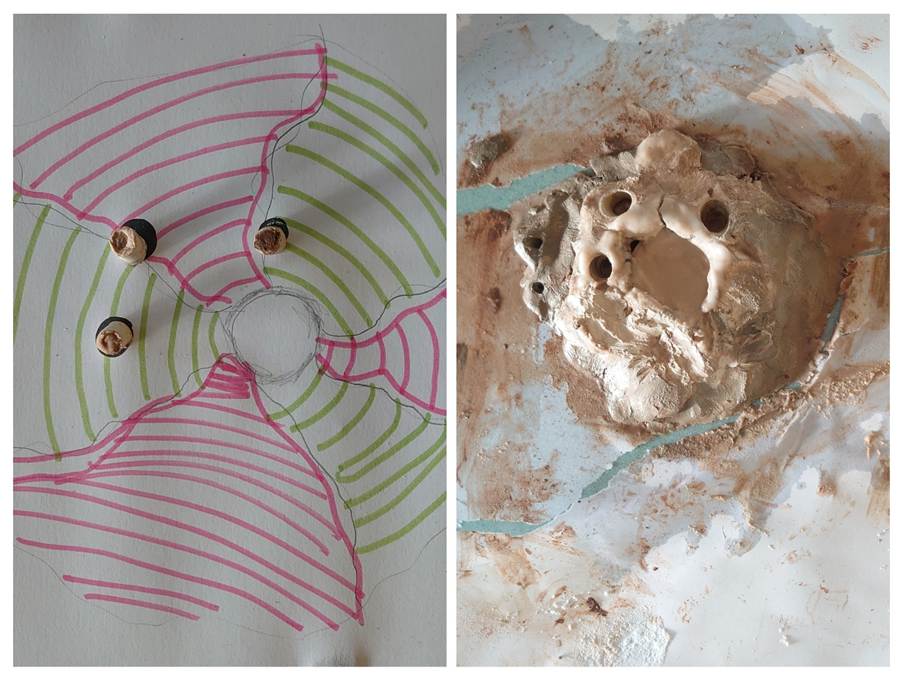 Volcanoes made by 13-year-old students, with lava hazard map on the left and the volcano made from clay on the right.